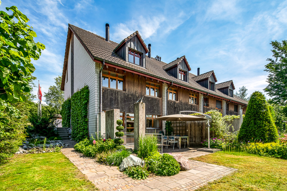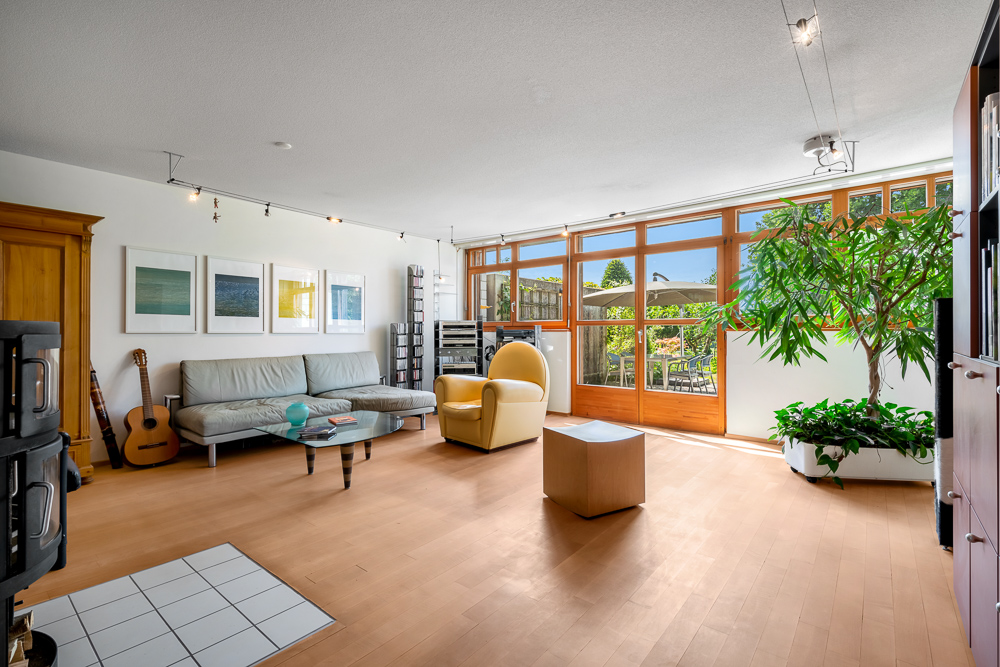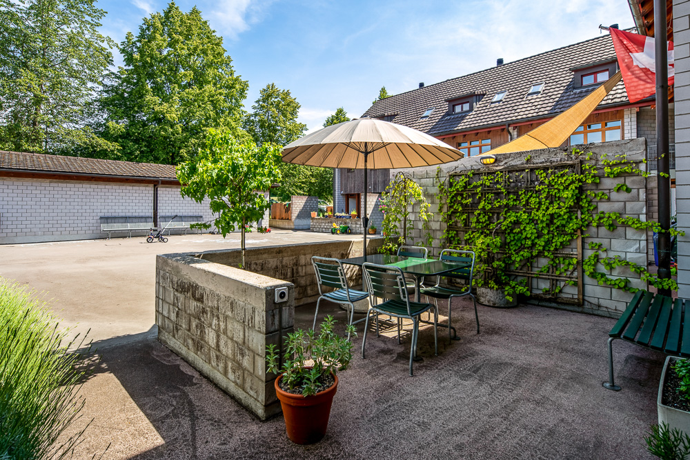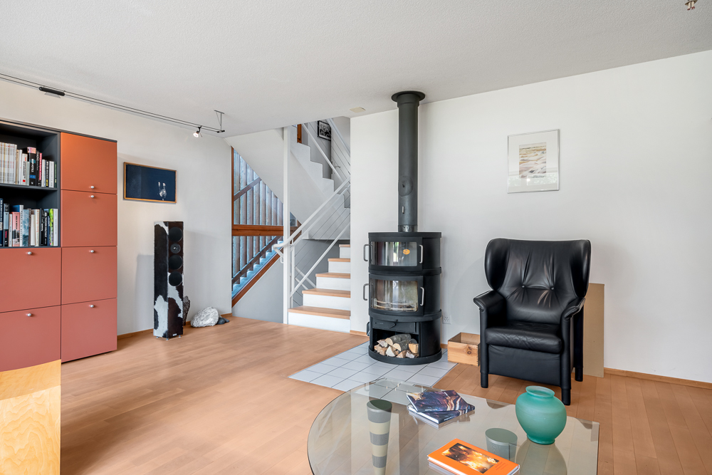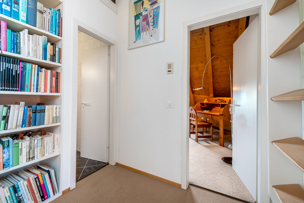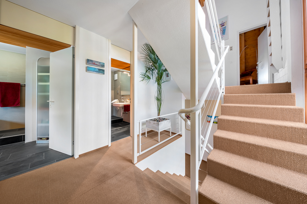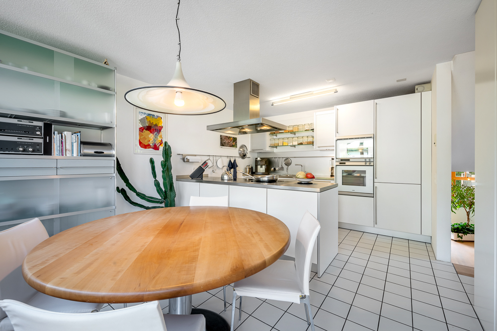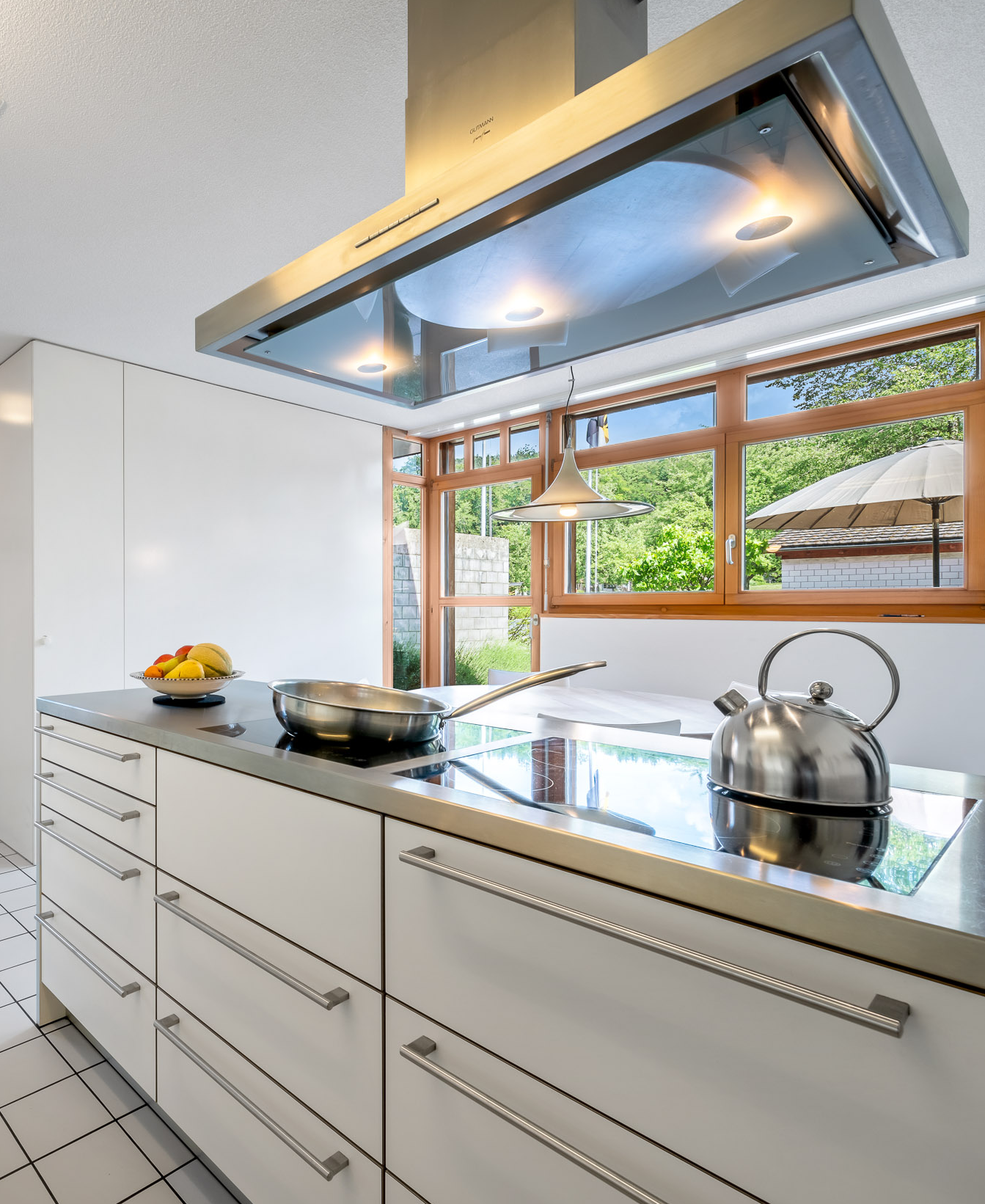 Das Entrée sorgt mit der eingebauten Garderobe dafür, dass alles seinen Platz hat. Die daran anschliessende Küche ist in Topzustand und mit allen Annehmlichkeiten ausgestattet. Das Herzstück jeder Küche, der Herd, besteht aus Induktionskochfeld, spezieller Wok-Herdplatte sowie einem fixen Chromstahl-Dampfabzug. Der Backofen, der separate Dampfgarer und der grosse Kühlschrank mit Gefrierfach komplettieren die Geräteliste. Die in Weiss gehaltene Küchenfront hat zahlreiche Schubladen, die einen komfortablen Zugriff zu den Kochutensilien ermöglichen. Diese Küche ist eine echte Hittnauerin, sie wurde von Lanz Küchen auf Mass angefertigt und teils mit Bulthaup-Elementen abgerundet.